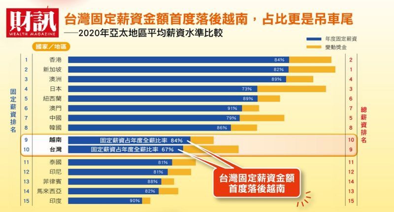 台灣在亞太15國之間,不但總薪資排在中後段,固定薪資更首度落後越南;值得注意的是,台灣的固定薪資在全薪的占比為67%,在15國中吊車尾,而變動獎金占比高達33%,更位居亞太之冠。其次,台灣愈高階的人力,領得的固定薪資相對愈低。台灣在亞太15國之中,專業人員、中階主管、高階主管三種職務固定薪資排名,分別排名第8、第9與第12。換言之,主管級的固定薪資,在亞太地區已經排在末段班。