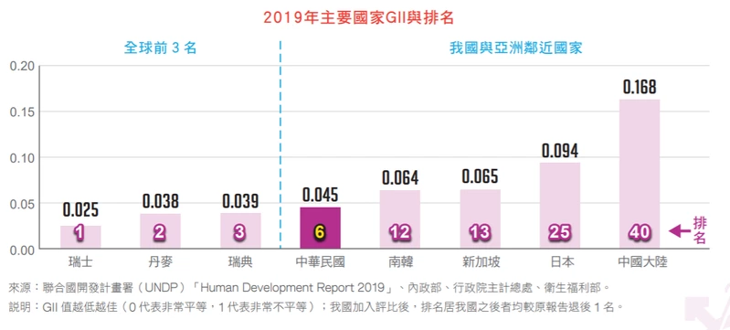 行政院性別平等處今發布「2021年性別圖像」,並依據聯合國開發計畫署(UNDP)最新編布的2019年性別不平等指數(GenderInequalityIndexGII),以生殖健康、賦權及勞動市場等5指標,衡量各國性別平等情形,我國資料代入計算後,性別平等表現較前一年進步3名,為全球第6名,居亞洲之冠;不過性別圖像也提醒,傳統性別刻板印象導致的後續職業性別隔離現象仍存在。