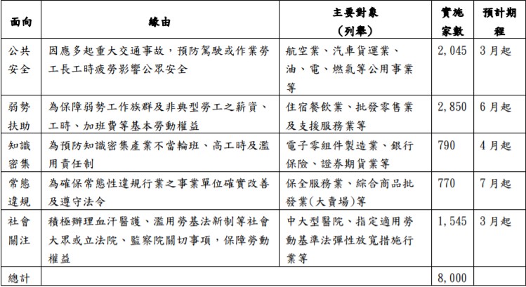 萬榮富說,舉例而言,航空業、汽車貨運業、油電燃氣等公用事業涉及「公共安全」,預計勞檢實施家數2045家;「弱勢扶助」則包括新住民、原住民等弱勢工作族群,還有非典型勞動者,這些人大多集中從事住宿餐飲業、支援服務業或批發零售業,預計勞檢2850家;血汗醫護、濫用勞基法新制、指定適用勞基法放寬的行業則屬「社會關注」面向,預計勞檢至1545家。